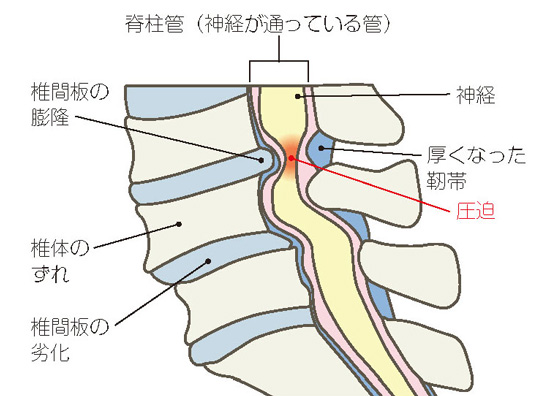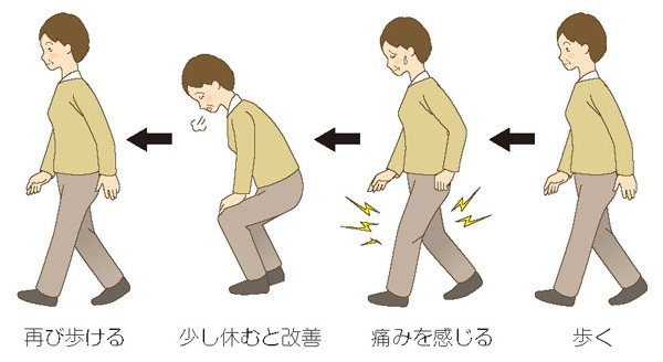 杉本 脊柱管狭窄症は、背骨がずれたり、椎間板がすり減ったり、何らかしらの原因(多くは加齢性変化)によって神経が通る管(脊柱管)が狭くなり神経を圧迫して痛みやしびれが出るものです。腰の脊柱管狭窄症(腰部脊柱管狭窄症)の場合、主な症状は脚の痛みやしびれだけでなく、一定の距離を歩くと痛みやしびれのために歩くことができなくなり、しばらく休憩すると歩けるけど、また歩き始めると再び歩けなくなるという間欠(性)跛行(かんけつせいはこう)が特徴的です。腰の椎間板ヘルニアの場合は前かがみになると腰や脚に痛みが出るのが特徴的ですが、腰部脊柱管狭窄症では、座ったり、前屈みになるなど背骨を曲げている状態だと症状が緩和する、といったことも参考になることがあります。